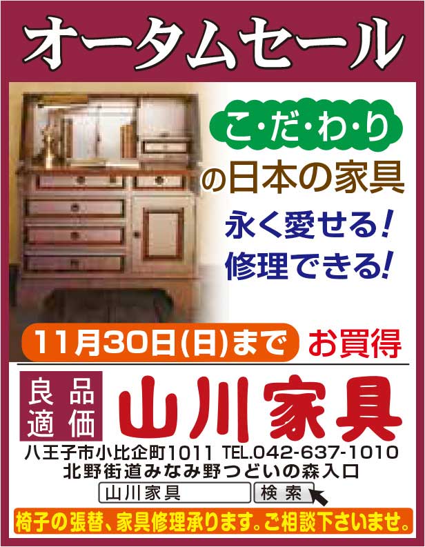 山川家具・本店では11月30日(日)までお買い得の『オータム・セール』を実施中。